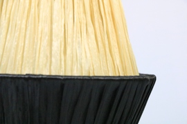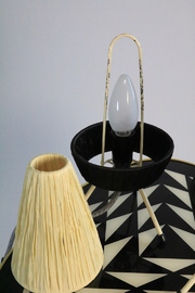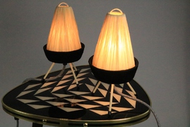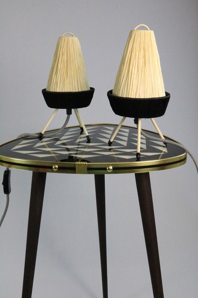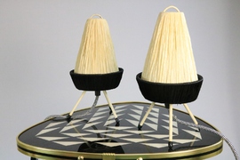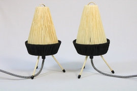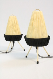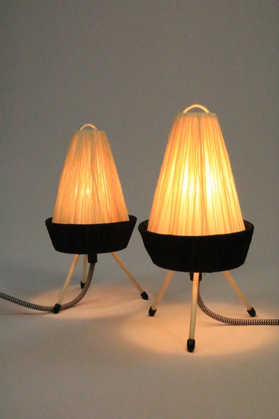 Two enchanting little table lamps made from raffia. Each stands on three filigree legs.