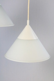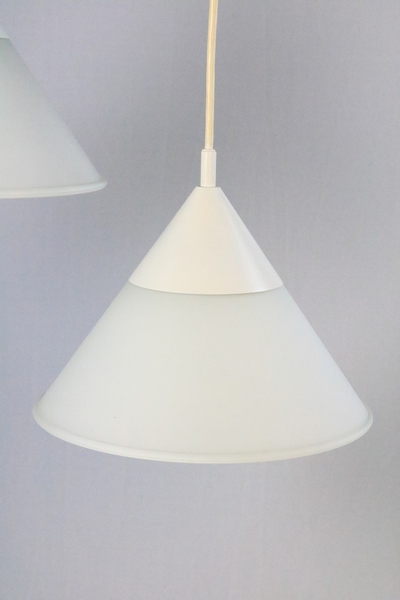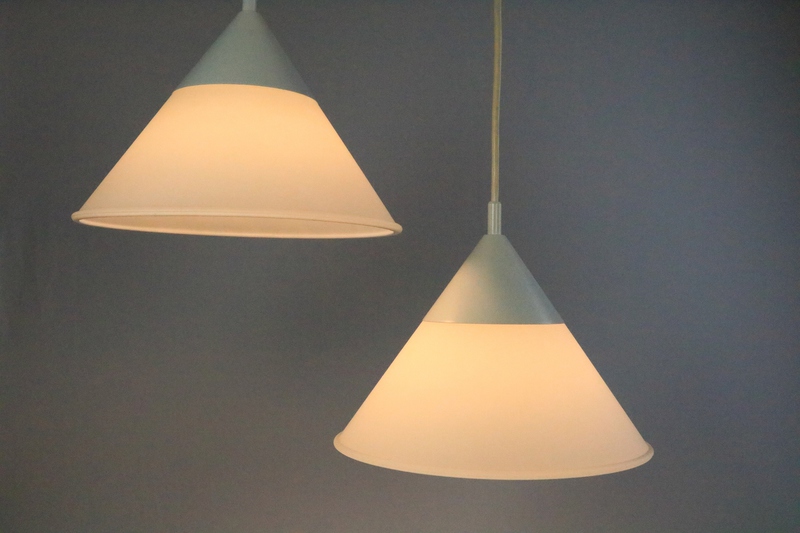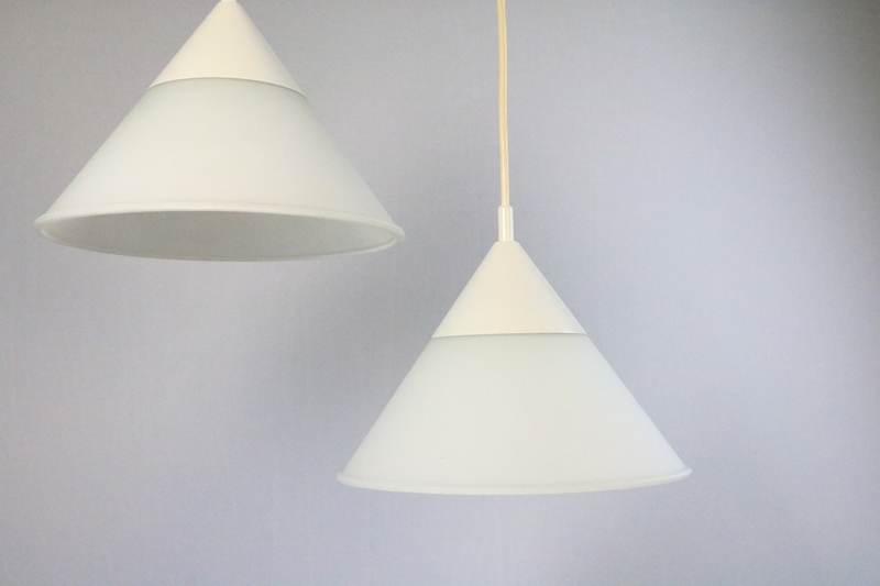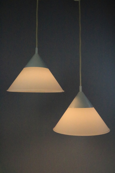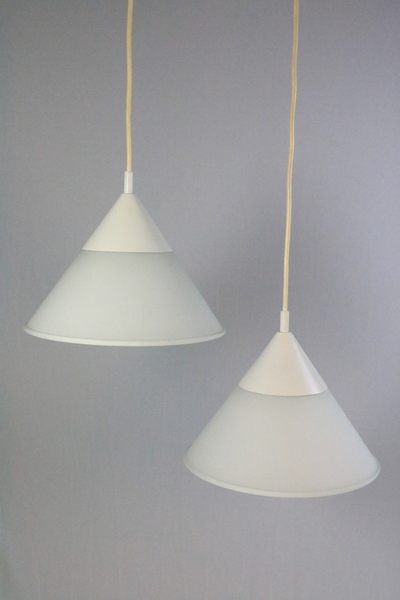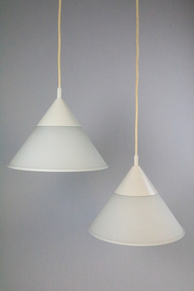 A set of two funnel-shaped hanging lamps.