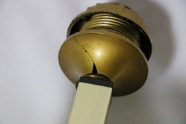 Sehr schön erhalten mit zwei kleinen Makeln: 1. eine Fassung ist im unteren Bereich stabil verklebt worden. Mit Schirm nicht mehr zu sehen. 2. Die Standplatten haben unterschiedliche Größen (siehe Maße). Nicht auf den ersten Blick wahrnehmbar.