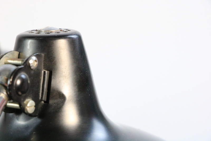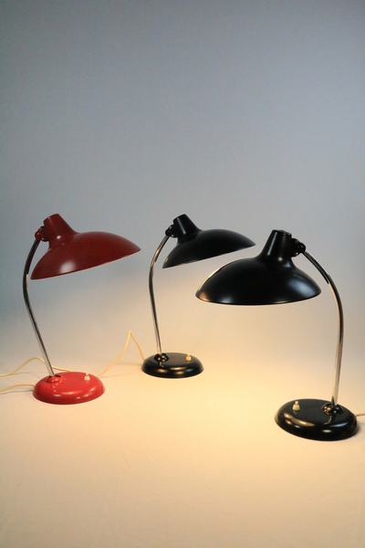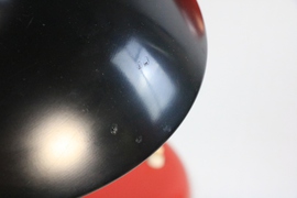 Mit einem verstellbaren schwarzen oder rot lackierten Metallschirm und einem verstellbaren verchromten Arm.