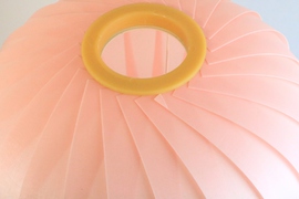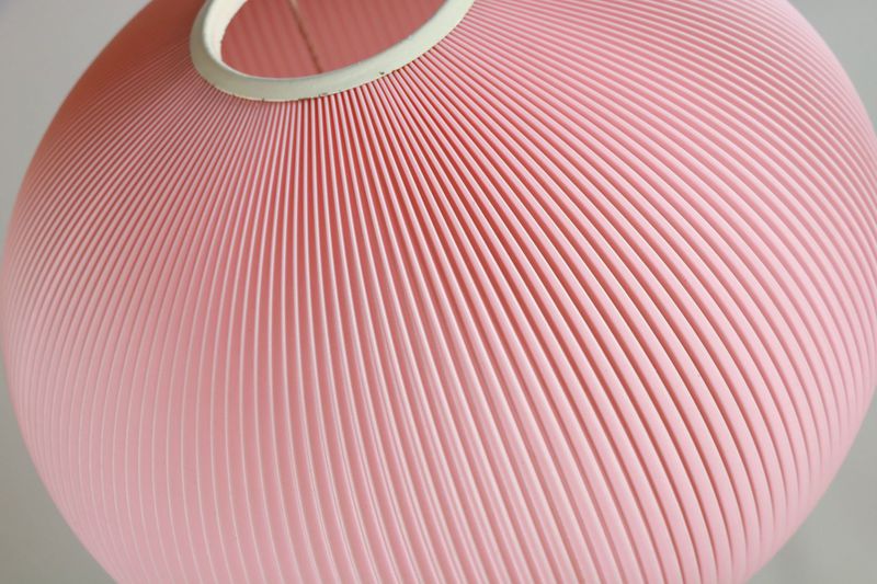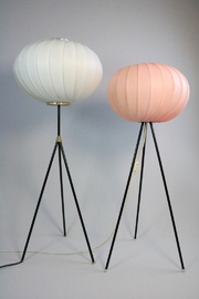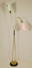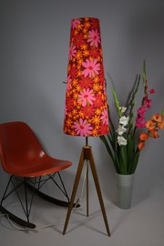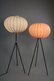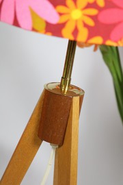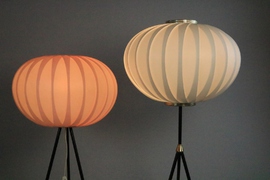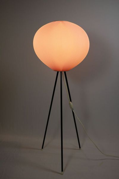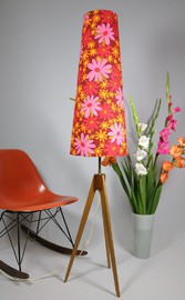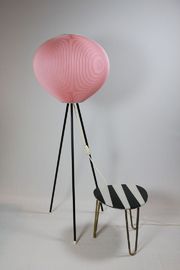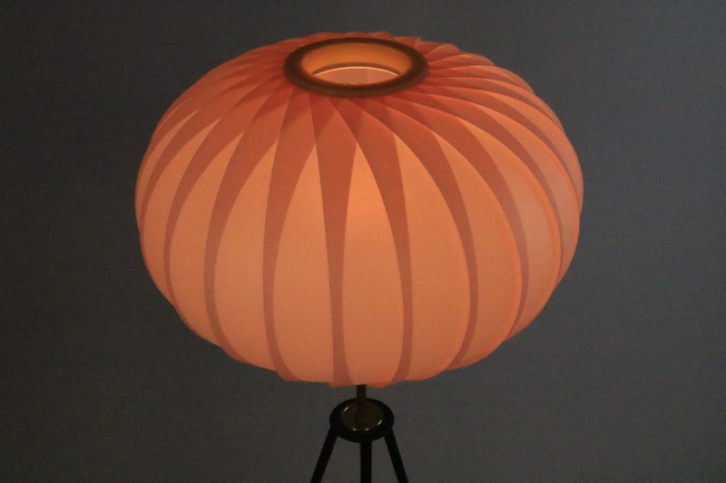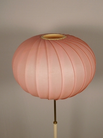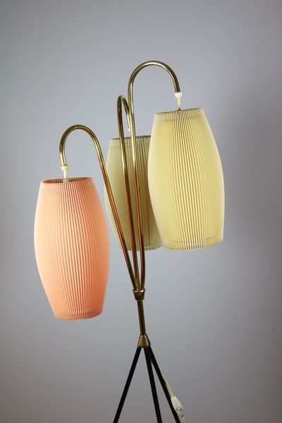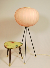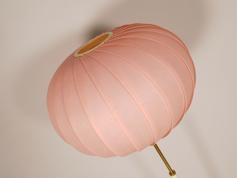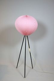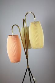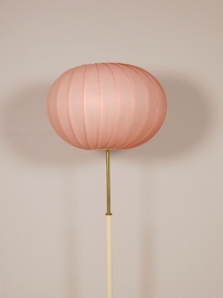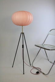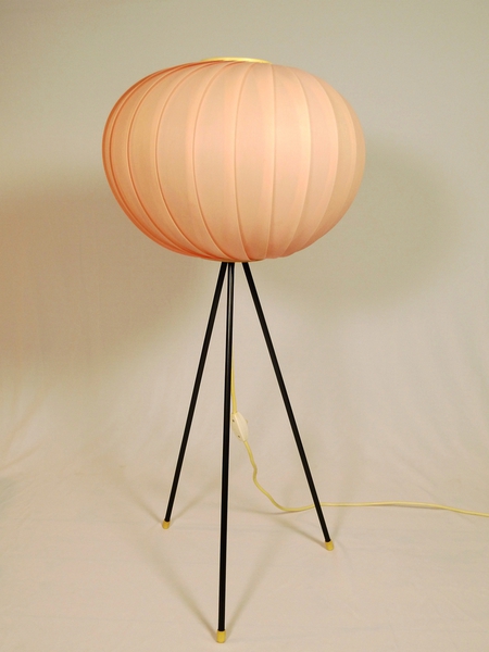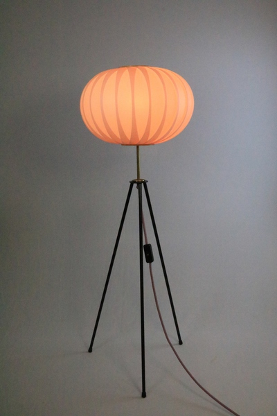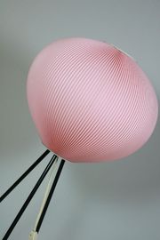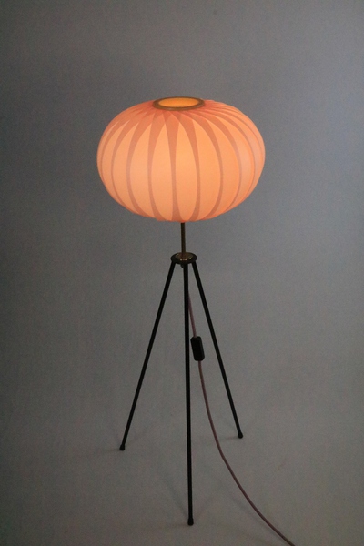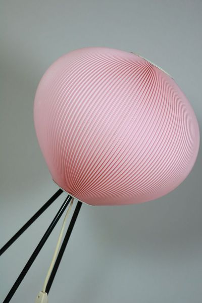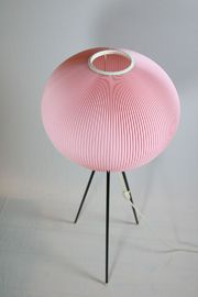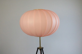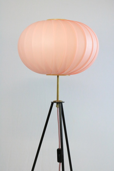 Wunderschöne Tripod Stehlampe mit rosa farbenem Lamellenschirm.