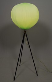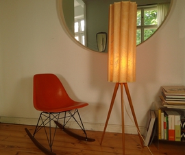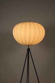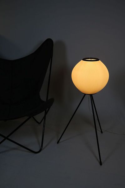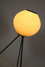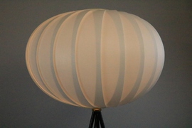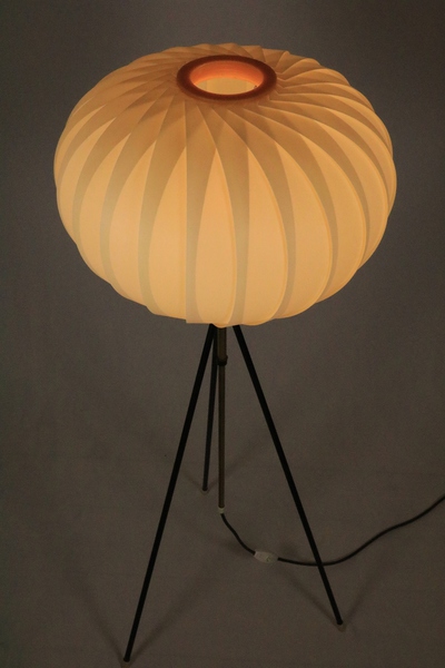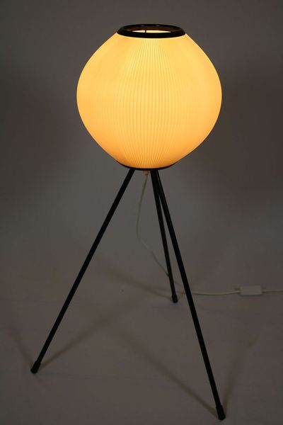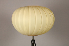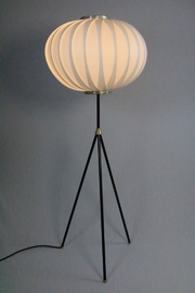 Tripod Stehlampe mit Lamellenschirm aus Kunststoff.