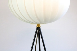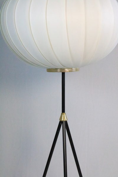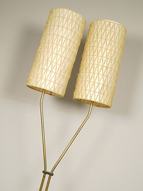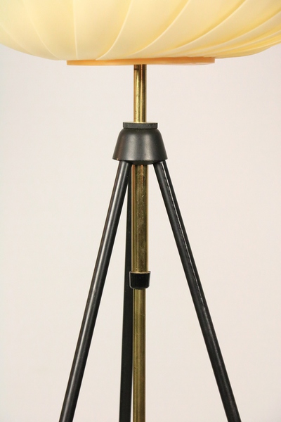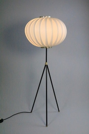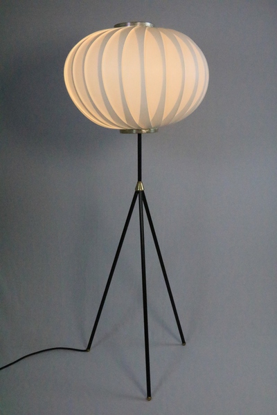 Tripod Stehlampe aus den 50er 60er Jahren. Mit weißem Lamellenschirm und hübschen goldenen Details.