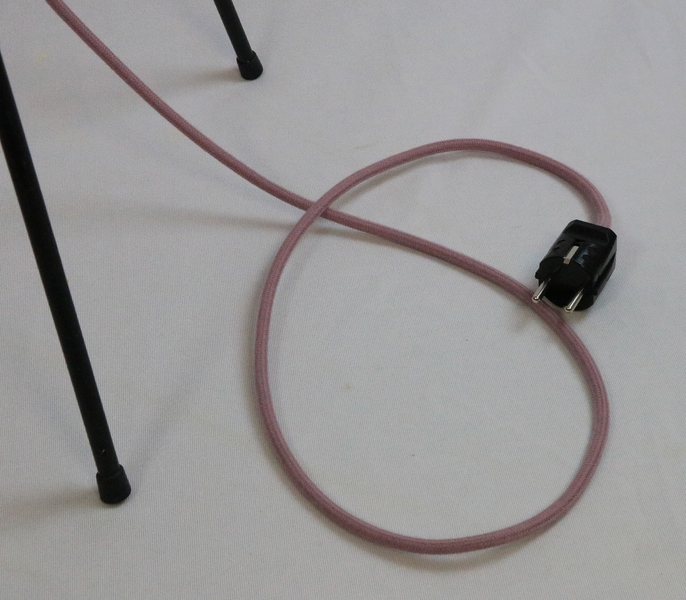 Neue Verkabelung mit passendem lila farbenem Textilkabel und schwarzem Schalter und Stecker.