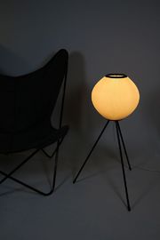 Filigrane Stehlampe mit drei dünnen Metallbeinen.