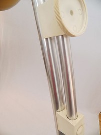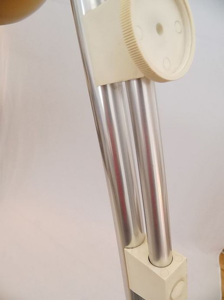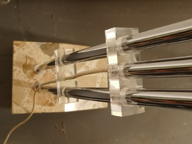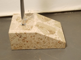 Marmorfuß, vermessingte Rohre, Plexiglasscharniere, Kunststoffschirm in schönem Beige. Toller Leuchteffekt.