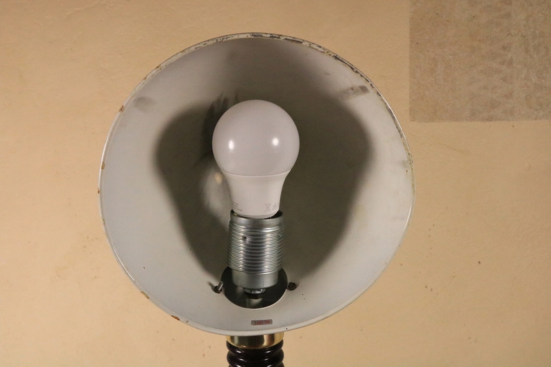 Schirm hat Gebrauchsspuren (innen schmutzig, leicht unrund, Lackabplatzer und Messing deutlich heller als der Fuß)