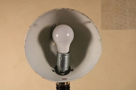 Shade has signs of use (dirty inside, slightly out of round, paint chipping and brass much lighter than the base).