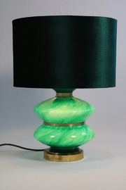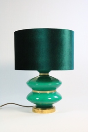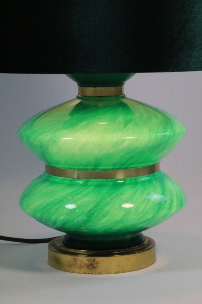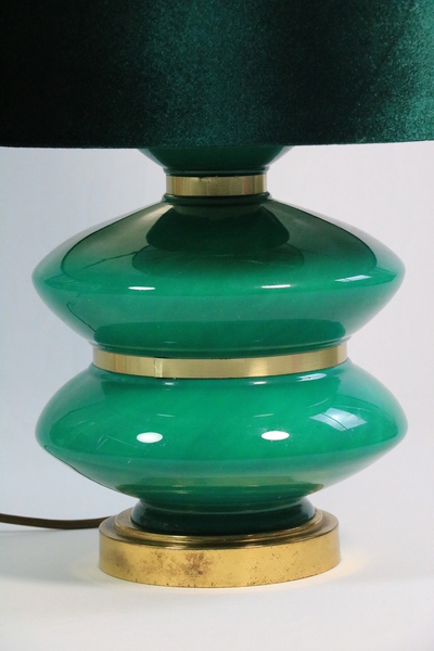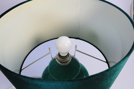 The green velvet shade matches the color perfectly, but is not original. The socket sits a little too low, slightly obscuring the glass base.