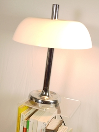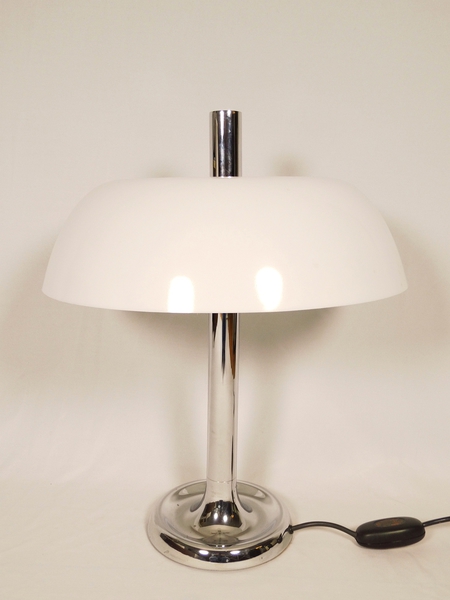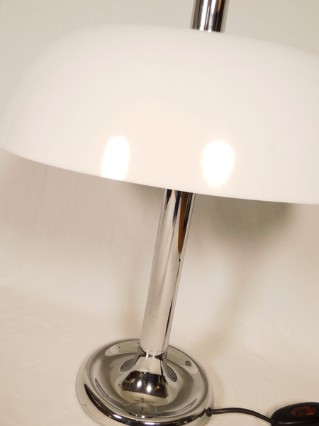 Tischlampe mit Chromfuß und Kunststoffschirm.