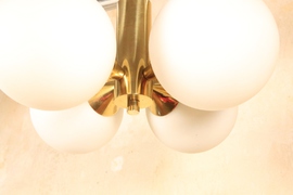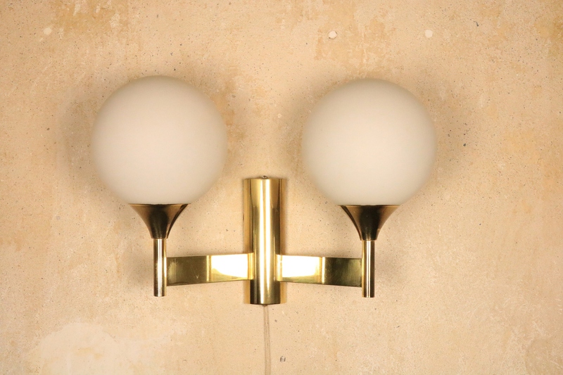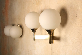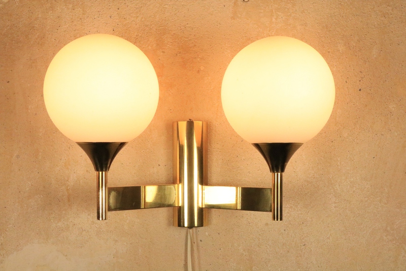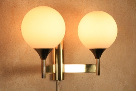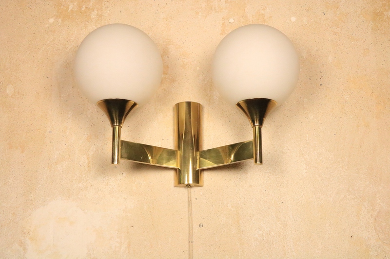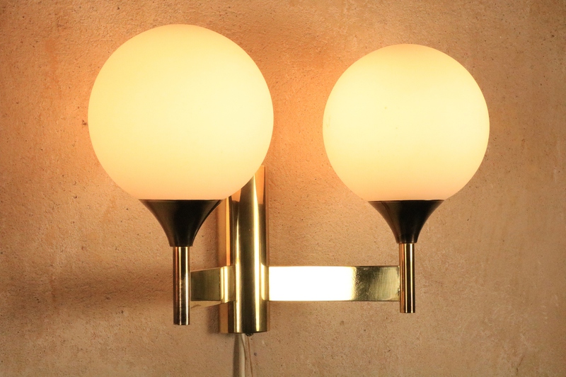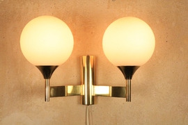 Wandlampe von Kaiser Leuchten mit Messinggestell und zwei Milchglas Kugeln.