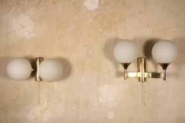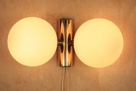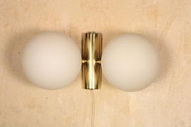 Wandlampe von Kaiser Leuchten mit Messinggestell und zwei Milchglas Kugeln.