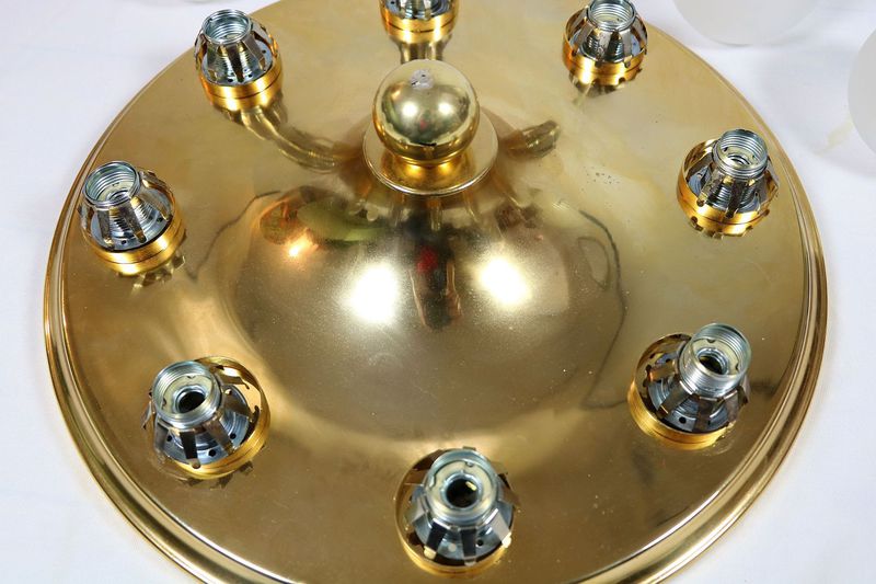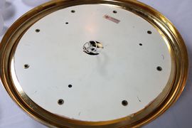 Die Messingplatte hat leichte Farbchangierungen und die Abschlusskugel aus vermessingtem Kunststoff hatte Abschürfungen und wurde daher mit Sprühlack ausgebessert. In leuchtendem Zustand alles verzeihlich!