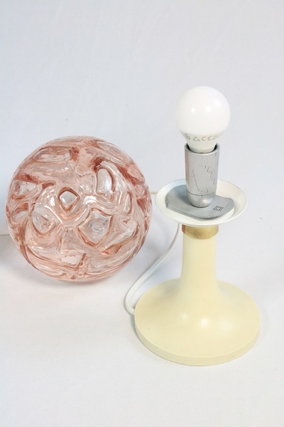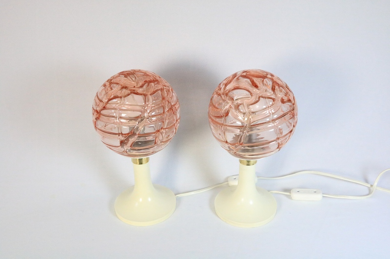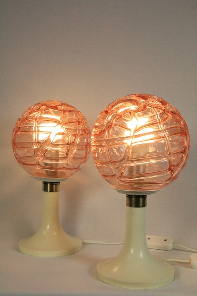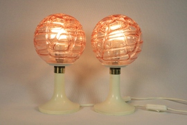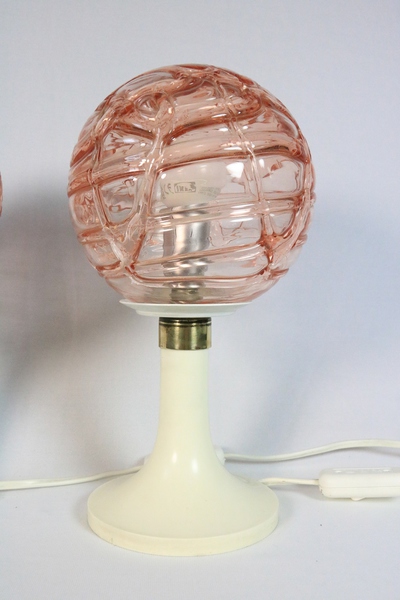 Pink, mouth-blown glass balls on a tulip base, plastic frame with brass detail.