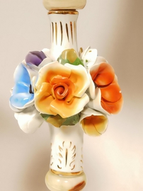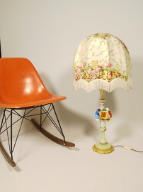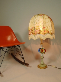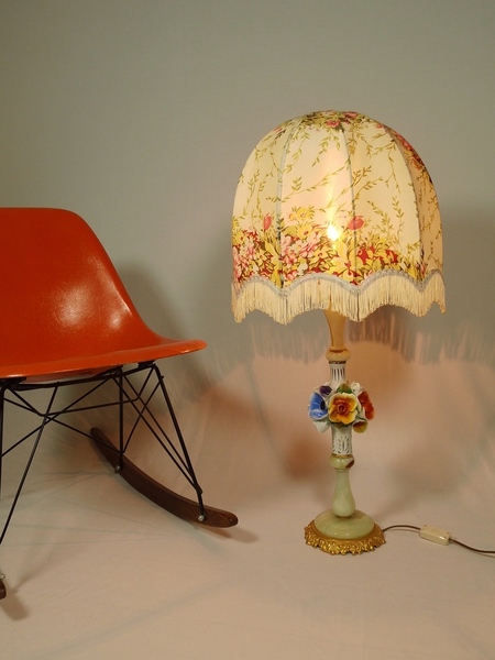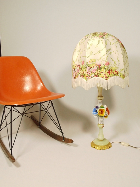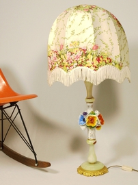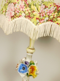 Bunter Fransenschirm im floralen Design ergänzt den Fuß mit Porzellanblüten.