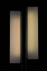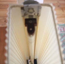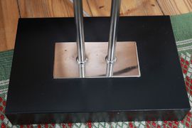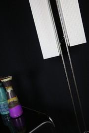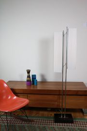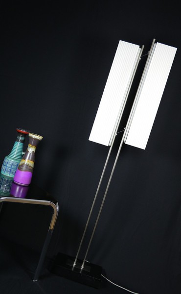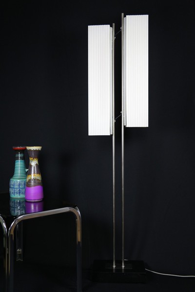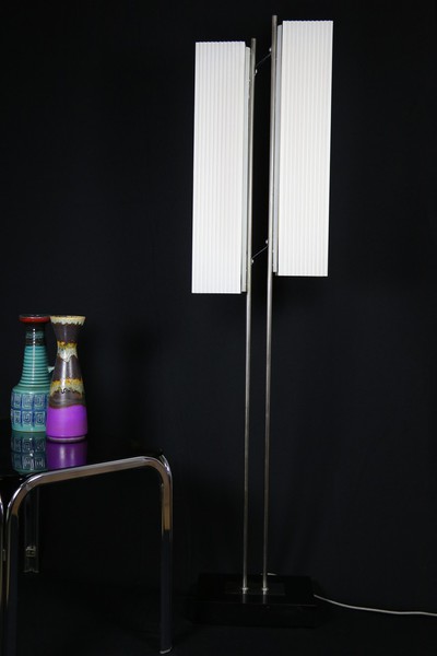 Schöner Klassiker der DDR. Stehlampe mit Neonröhren, Kunststoffschirmen. Stahlgestell. 150 cm Teilrestauriert, schöner Zustand, leichte Farbänderung im Innern.