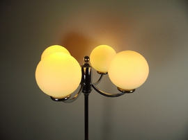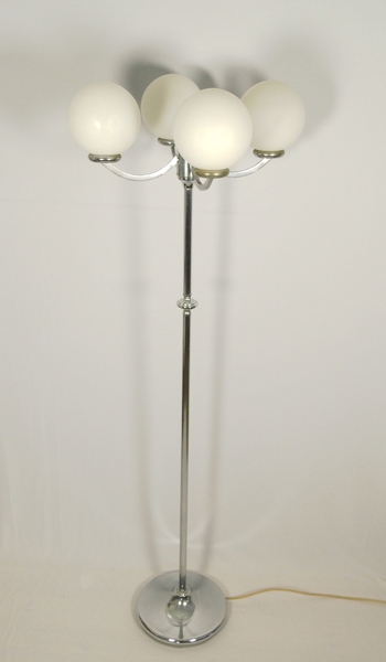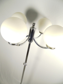 Stehlampe aus Chrom mit vier Milchglaskugeln, original aus den 60er 70er Jahren. Art Deco Stil.