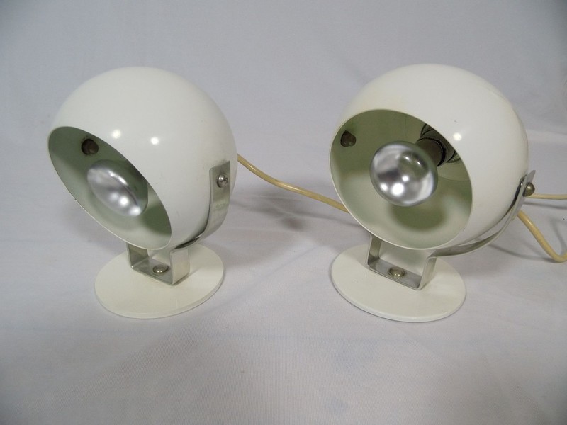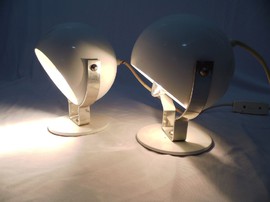 Schönes Pärchen aus den 70er Jahren. Vielseitig einsetzbar. Gut erhalten mit vergilbten und etwas starren Kabeln, wenige Kratzer rückseitig. Ca. 18 cm hoch, Durchmesser Kugel ca. 14 cm.