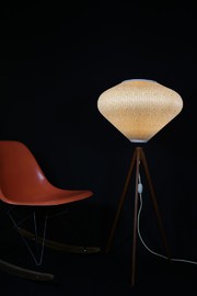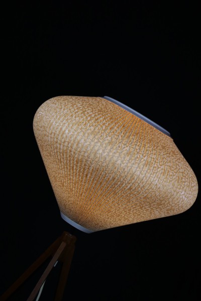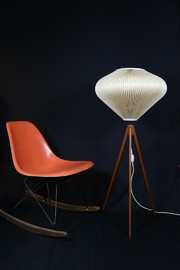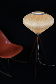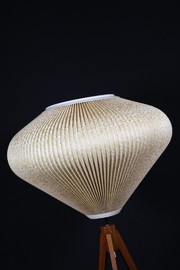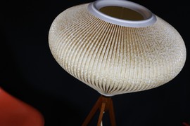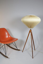 Stimmungsvolle Stehlampe aus den 50er Jahren, mit Tripodgestell aus Holz.