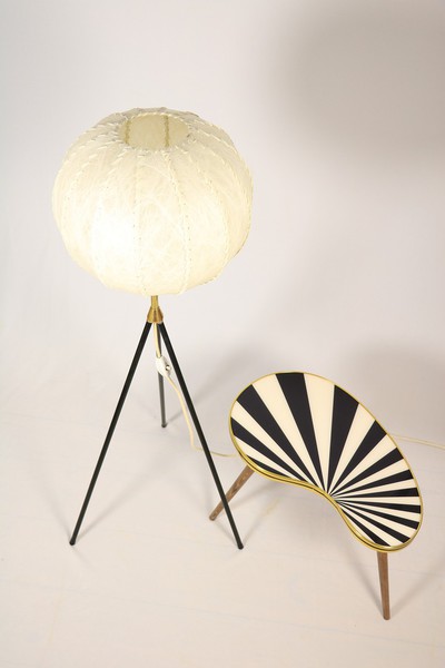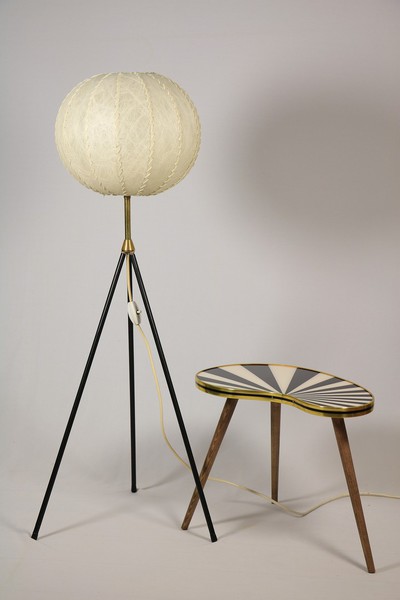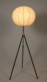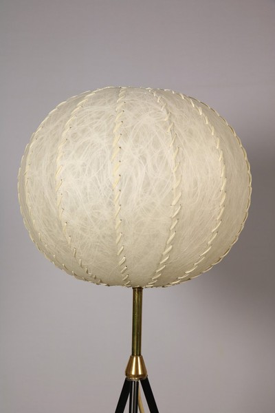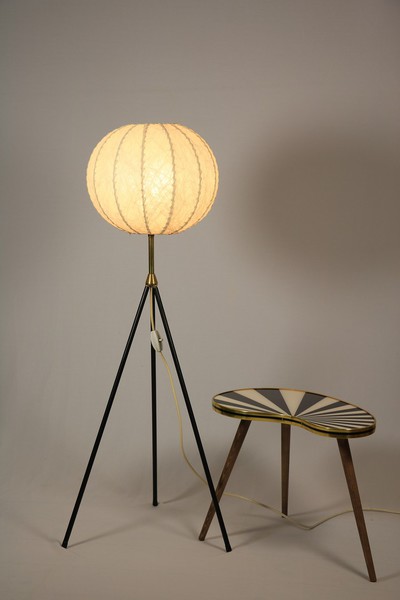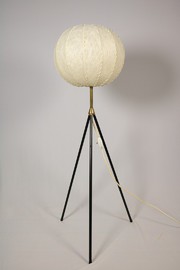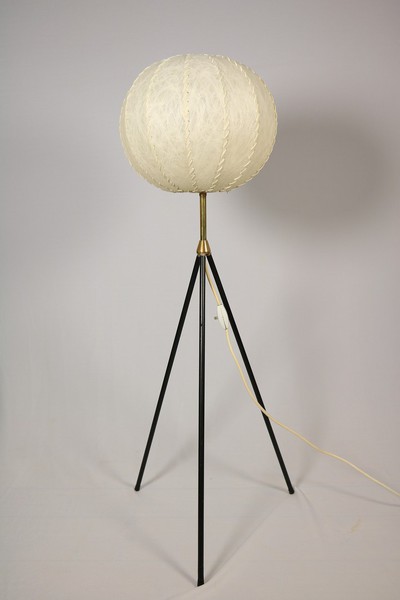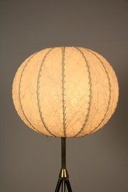 Tripod Stehlampe mit schwarz lackierten dünnen Metallbeinen und Messinganteil.