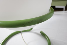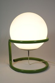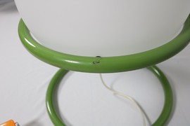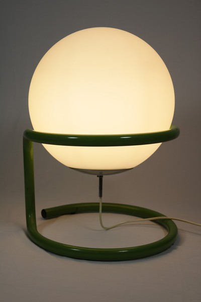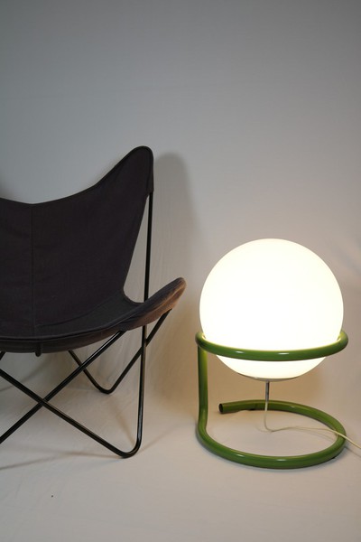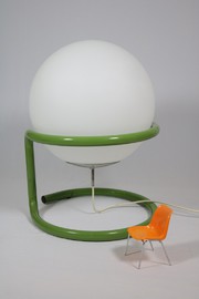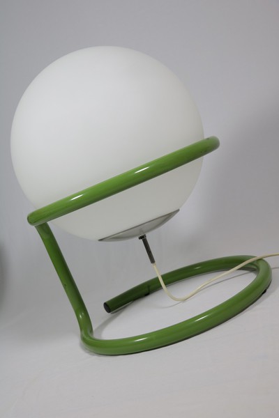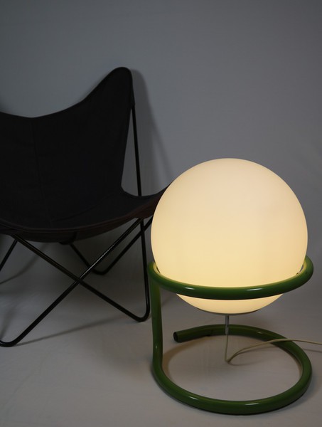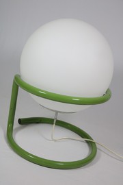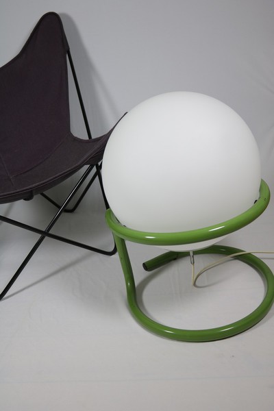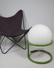 Große Kugellampe in grünem Metallgestell.