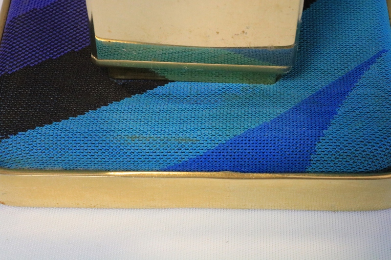 Der Stoff am Sockel ist leicht fleckig. An einem Fuß befindet sich ein sehr kleines Loch, das jedoch kaum auffällt. Siehe Fotos.