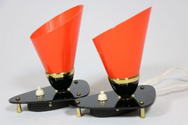 Ausgesprochen seltene, hübsche, kleine Tischlampen aus Kunststoff und Messing.