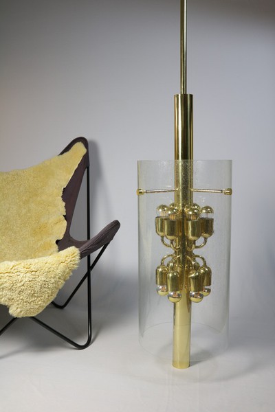 Das Messinggestell ist mit 12 x E27 Fassungen bestückt, die mit Kopfspiegelbirnen am schönsten leuchten.
