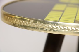 Gut erhalten mit Kratzerchen auf der Glasplatte, Flecken im Messing und im Umleimer.
