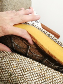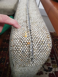 Sehr schöne, gut erhaltene, abnehmbare Polster mit Reißverschluss, der um die Ecke zu öffnen ist und für qualitative Verarbeitung spricht. Innen sind sowohl die Rückenlehnen als auch die Sitzpolster