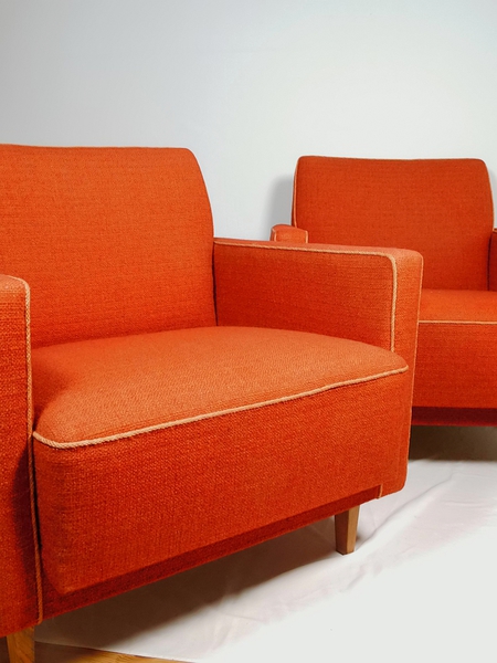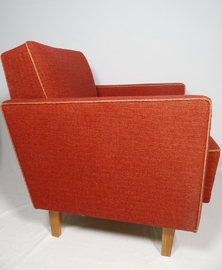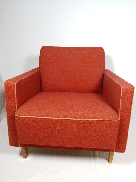 Hochwertige Loungesessel in kräftigem rotem Hopsackbezug.
