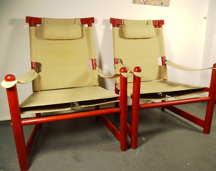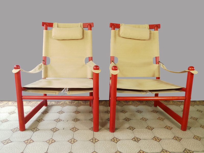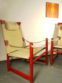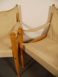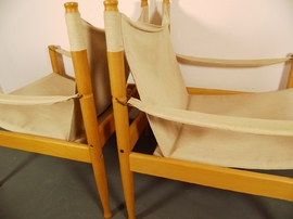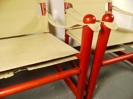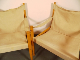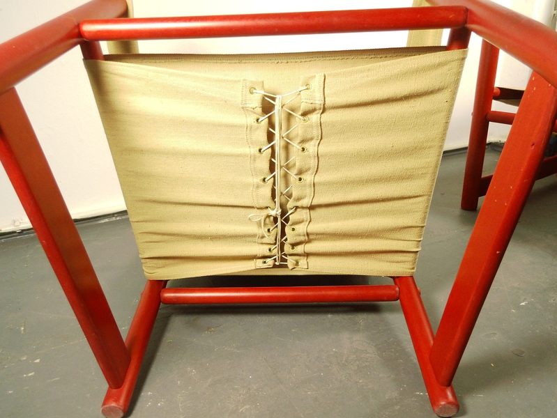 Bezug hat kaum Gebrauchsspuren. Das Segeltuch hat im Sitzbereich an den Ösen leichte Einrisse. Dies ist eine sehr übliche Abnutzung an diesen Sesseln und verharrt aus Erfahrung in diesem Stadium über Jahre hinweg ohne Funktionseinschränkung.