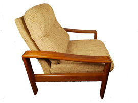 Die Polster sind tip top. Wurden vermutlich mal neu bezogen, mit Reißverschluss. Können ohne großen Aufwand mit einem zum Original passenden Stoff neu bezogen werden.