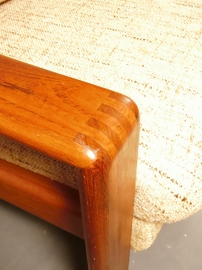 Teakholz massiv mit schönen Zapfen an den Armlehnen.