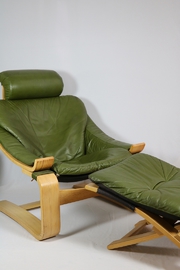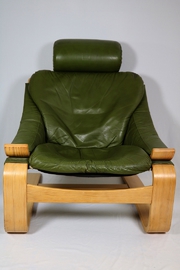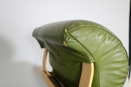 Vor allem selten in diesem schönen grünen Leder zu finden. Leichte Patina am Leder (siehe letztes Foto Kopfstütze). Fichtenholz.