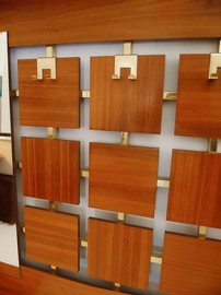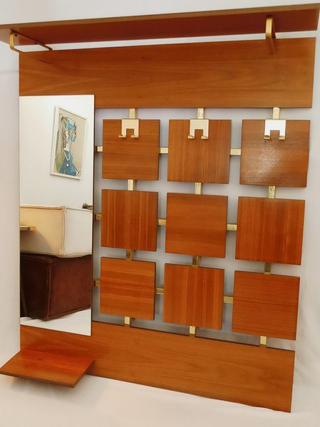 Sehr schöne und nahezu makellose Garderobe der 60er Jahre mit vermessingten Aluhaken und Teakfurnier. Hochwertige und schwere Ausführung. 100 cm hoch, 117 cm breit.