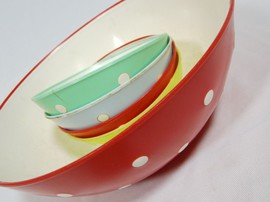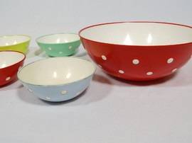 Zuckersüße Schälchen der 50er Jahre, aus Plastik mit Pünktchen. Nur noch zu Dekozwecken nutzbar, da viele Kratzer.