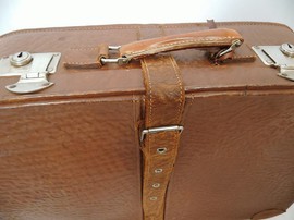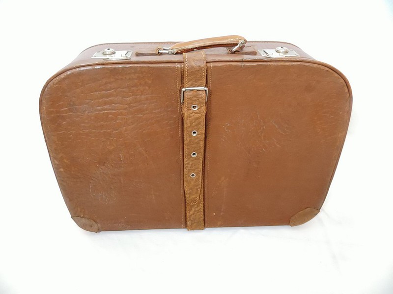 Tolles Deko-Objekt der 50er für allerlei Inhalt: Lederkoffer mit schönem Vintagecharakter und Schlüssel. Eine Niete der Schnalle fehlt.