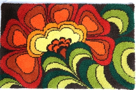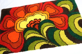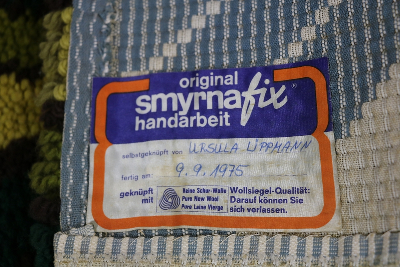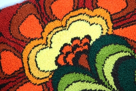 Eine Original Handarbeit der 70er Jahre (siehe Signatur auf der Rückseite) mit absolut zeittypischem Dekor.